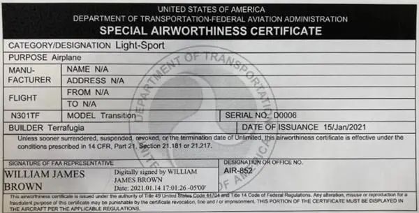 美国FAA适航证是全球最难取得的证书之一,其适航条款要求异常苛刻。太力飞车副总裁Kevin Colburn介绍,在疫情期间团队历时数月,完成80天飞行测试,交付150份技术文档;通过了FAA对研制流程、设计资料、试飞数据等严格审核,获得LSA(Light-Sport Aircraft)轻型运动类飞机适航证。本次获得适航证的太力飞车Transition (TF-1)采用混合动力技术,机身以复合材料为主,设计最大起飞重量约850kg,巡航速度每小时167km,巡航高度可达3000m,航程可达670km,可搭载两人。