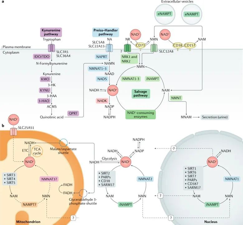 图1 | NAD+代谢。 a | 烟酰胺腺嘌呤二核苷酸(NAD+)生物合成途径。NAD+水平由3个独立的生物合成途径维持。犬尿酸途径(或从头合成途径)利用食物中的氨基酸色氨酸产生NAD+。色氨酸通过转运蛋白SLC7A5和SLC36A4进入细胞。在细胞内,色氨酸被限速酶吲哚胺2,3-双加氧酶(IDO)或限速酶色氨酸2,3-双加氧酶(TDO)转化为N-甲酰基脲嘌呤。N-甲酰基犬尿素转化为l-犬尿素,再经犬尿素 3-单加氧酶(KMO)转化为3-羟基犬尿素 (3-HK),再经色氨酸2,3-双加氧酶(KYNU)转化为3-羟基氨基苯甲酸(3-HAA)。利用3-羟基苯甲酸加氧酶(3HAO)合成α-氨基-β-羧酸ε-半醛(ACMS)。该化合物可自发缩合重组为喹啉酸,喹啉酸经喹啉酸磷酸核糖基转移酶(QPRT)转化为烟酰胺单核苷酸(NAMN),并与Preiss-Handler通路汇合。Preiss-Handler通路使用饮食烟酸(NA),NA通过SLC5A8或SLC22A13转运蛋白进入细胞,通过烟酸转磷酸核糖基酶 (NAPRT)生成NAMN,NAMN然后通过烟酰胺单核苷酸腺苷酸转移酶(NMNAT1 NMNAT2和NMNAT3)转换成烟酸腺嘌呤二核苷酸(NAAD)。这一过程是通过NAD+合成酶(NADS)将NAAD转化为NAD+完成的。NAD+回收途径回收作为NAD+消耗酶(乙酰化酶, 聚(ADP -核糖)聚合酶(PARPs),NAD+糖水解酶和环ADP -核糖合成酶CD38, CD157和SARM1)酶活性副产物的烟酰胺(NAM)。首先,细胞内的烟酰胺磷酸核糖基转移酶(iNAMPT)将NAM循环为烟酰胺单核苷酸(NMN),NMN再通过不同的NMNATs转化为NAD+。NAM可被烟酰胺N -甲基转移酶(NNMT)选择性甲基化,并通过尿液分泌。在细胞外空间,NAM是胞外酶CD38和CD157的副产物,可以通过胞外NAMPT (eNAMPT)转化为NMN。然后NMN被CD73去磷酸化成为烟酰胺核苷(NR),NR通过一个未知的核苷转运体转运到细胞中。NMN可以通过NMN特异性转运体(小肠中SLC12A8)导入细胞。在细胞内,NR通过烟酰胺核苷激酶1和2 (NRK1和NRK2)形成NMN。然后NMN被NMNAT1,NMNAT2和NMNAT3转换成NAD+。b | 不同亚细胞室的NAD+代谢。NAD+稳态是不同亚细胞间室合成、消耗和再生的平衡,受亚细胞特异性NAD+消耗酶、亚细胞转运蛋白和氧化还原反应的调控。NAD+前体通过三种生物合成途径进入细胞(a部分)。在细胞质中,NAM通过细胞内NAMPT (iNAMPT)转化为NMN。然后NMN被NMNAT2转化为NAD+,NMNAT2是该酶的胞质特异性亚型。NAD+在糖酵解过程中被利用,产生NADH, NADH通过苹果酸/天冬氨酸穿梭和甘油醛3-磷酸穿梭转移到线粒体基质。通过苹果酸/天冬氨酸穿梭进入的线粒体NADH被电子传递链(ETC)中的络合物I氧化,而从甘油醛3-磷酸穿梭中生成的还原黄素腺嘌呤二核苷酸(FADH2)被络合物II氧化。最近,人们发现了哺乳动物NAD+线粒体转运体SLC25A51,并证实它与细胞器中完整的NAD+摄取有关。线粒体中NAD+的回收途径尚未完全解决,但已经提出了一种特异的NMNAT亚型(NMNAT3)的作用。在线粒体中,NAD+被依赖NAD+的线粒体SIRT3-SIRT5消耗,产生NAM。目前还不清楚在线粒体内NAM是否能被转化回NMN或转化为NAD+,其他前体是否能通过线粒体膜运输来促进NAD+的合成。核NAD+池可能通过核孔扩散与胞质NAD+池相平衡;然而,完整的动态在很大程度上仍未被探索。一种核特异性NMNAT亚型(NMNAT1)已被描述,它是核NAM回收NAD+途径的一部分。MNAM, N1-甲基烟酰胺;TCA,三羧酸。框1| 通过NAM回收途径生成NAD+
