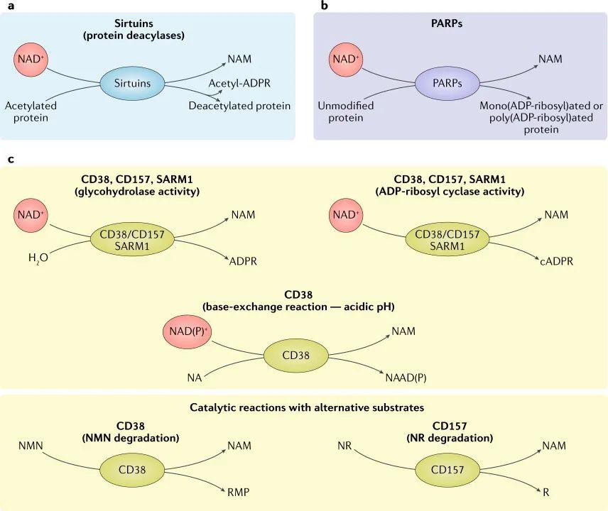 图2 | 三种主要的NAD+消耗酶。a | 乙酰化酶使用烟酰胺腺嘌呤二核苷酸(NAD+)作为辅助底物从目标蛋白上的赖氨酸残基上去除酰基。NAD+被分解,产生烟酰胺(NAM)和ADP -核糖,其中ADP -核糖作为酰基受体,产生乙酰- ADP -核糖(乙酰- ADPR)。b | 聚(ADP -核糖)聚合酶(PARP1-PARP3)使用NAD+作为单(ADP -核糖)或聚(ADP -核糖)靶蛋白的共底物,产生NAM作为副产物。c | NAD+糖水解酶与环ADP -核糖(cADPR)合成酶(CD38, CD157和SARM1)的反应。这组蛋白质的主要催化活性是将NAD+水解成NAM和ADP -核糖。在较小程度上,CD38、CD157和SARM1具有ADP-核糖基环化酶活性,从NAD+中产生NAM和cADPR。在酸性条件下,CD38也可以进行碱基交换反应,将NAD(P)+的NAM交换为烟酸(NA),生成烟酸腺嘌呤二核苷酸(磷酸盐)(NAAD(P))。据报道,CD38和CD157在其催化反应中可以使用替代底物。CD38可降解NMN为NAM和核糖单磷酸(RMP),而CD157可降解NR,生成NAM和核糖(R)。NR,烟酰胺核苷。(3)NAD+在细胞中作用