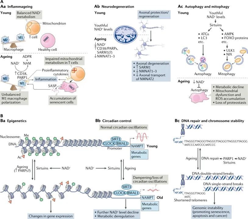 图3 | 衰老过程中NAD+代谢。A:降低烟酰胺腺嘌呤二核苷酸(NAD+)水平涉及与衰老相关的多种生物学过程。Aa :衰老与异常的促炎免疫细胞激活或“炎症”有关,导致持续的低级别炎症。这部分是由衰老细胞的积累引起的,通过衰老相关的分泌表型(SASP)促进巨噬细胞表型向促炎M1状态极化,从而导致炎症。有证据表明,在这些巨噬细胞对SASP的反应中,NAD+消耗酶CD38和多聚(ADP -核糖)聚合酶(PARPs)的表达增加,导致NAD+水平下降,这些机制对衰老过程中NAD+水平的降低起到重要作用。此外,有研究表明,在衰老的T细胞中线粒体功能下降,导致了促炎细胞因子的分泌增加,促进炎症状态,也导致衰老。Ab:轴突变性是许多年龄相关神经元疾病的前兆,其特征是快速的NAD+损耗。在正常生理条件下,NAD+生物合成酶,烟酰胺单核苷酸腺苷转移酶(NMNATs)对轴突变性具有保护作用,其表达支持轴突的维持和防止神经退行性变。特别是,NMNAT2在轴突中是一个重要的生存因子,,实现快速的周转需要不断地将它从其合成的体细胞运送到轴突,而这些运输过程在轴突变性过程中受到干扰。此外,NAD+消耗酶SARM1被轴索损伤激活,通过促进NAD+降解介导轴索变性。Ac:自噬是一个关键的细胞分解过程,允许细胞适应不同的营养可用性,并服务于细胞质量控制,允许清除缺陷细胞器和蛋白质。自噬通过Sirtuins(主要是SIRT1)调控下游的NAD+水平。NAD+水平的下降降低了整体自噬通量,以及通过线粒体自噬选择性地去除线粒体,提示自噬缺陷可能是衰老过程中NAD+消耗的结果,导致细胞功能障碍。B:因为NAD+是多种酶的辅助因子,NAD+的丢失影响多种细胞过程。例如,表观遗传调控因子如SIRT1的活性需要NAD+,其水平的下降会引起组蛋白修饰的改变,从而影响基因表达中的染色质组织和功能。有证据表明,与衰老相关的NAD+缺失与PARPs表达增加有关,这可能是由于衰老过程中DNA损伤水平的增加和DNA修复的需要(Ba)。NAD+也影响核心时钟组件clock和BMAL的转录活性,从而调节重要代谢基因的昼夜节律表达以及烟酰胺磷酸核糖转移酶(NAMPT),而这反过来是NAD+水平昼夜节律振荡所必需的(Bb)。降低的NAD+水平也干扰DNA修复中PARPs和Sirtuins的活性,导致基因组不稳定,即衰老和癌症的标志产生(Bc)。ADPR,ADP-ribose;ATG,自噬相关蛋白;FOXO,叉头盒蛋白O;ROS,活性氧。(二)衰老中的NAD+依赖机制