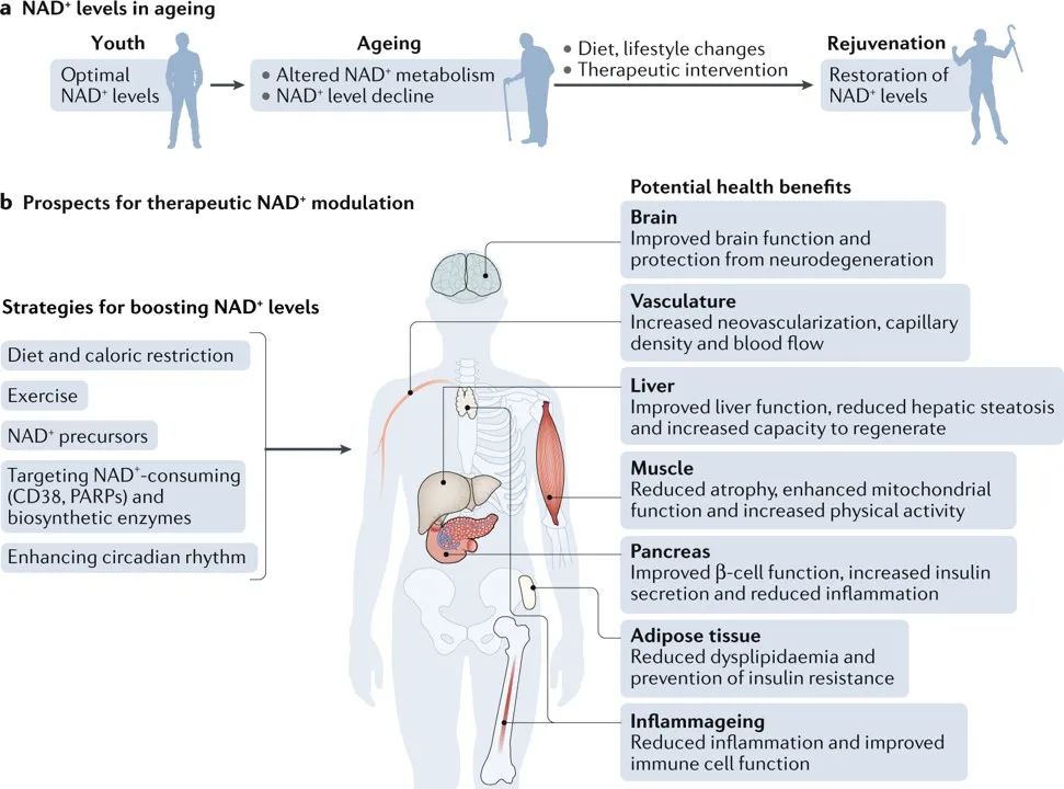 图4 | 恢复NAD+水平的治疗方法及其对健康的影响。衰老与降低烟酰胺腺嘌呤二核苷酸(NAD+)水平有关,这会促进或加剧与衰老相关的疾病。因此,恢复NAD+水平已成为预防和治疗衰老相关疾病,恢复老年人的健康和活力的一种方法 (a),目前有一些潜在的措施来提高NAD +水平,包括生活方式的改变,例如增加锻炼,减少卡路里的摄入量,每天健康饮食和遵循一个一致的昼夜节律模式、符合健康的睡眠习惯和进餐时间。另一种方法是使用小分子抑制剂或激活剂来促进NAD+的生物合成,以及使用膳食补充剂,包括NAD+前体,如烟酰胺单核苷酸和烟酰胺核糖苷。所有这些方法都能提高组织NAD+水平,对健康有益,可以改善组织和器官功能,防止认知能力下降,改善新陈代谢健康,减少炎症和增加生理益处,这些可能共同发挥作用延长病人的健康寿命和潜在的寿命(b)。(1)代谢功能障碍