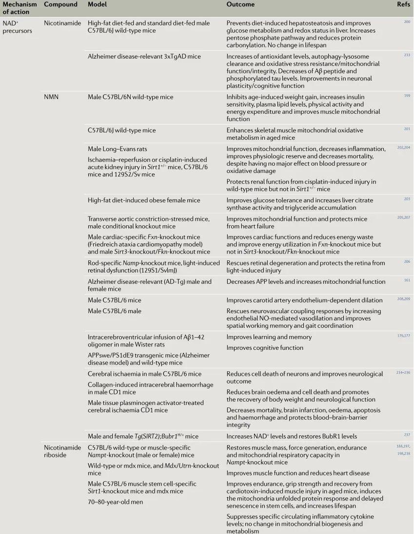 迄今为止,很少有研究调查NMN、NAM和NR对延长野生型小鼠的健康寿命和/或寿命的影响。在一项研究中,从5个月大开始长期(1年)喂养NMN小鼠可提高全身胰岛素敏感性,能量代谢和体力活动,并改善血脂状况,而没有明显的毒性作用。在另一项研究中,长期施用NAM可以预防与高脂饮食有关的疾病,促进健康,但对寿命没有显著影响。最后,在老年小鼠中服用NR可以延长寿命(5%),但幅度很小。这些结果反映出大多数使用NAD+前体的临床前研究都集中于通过抵消以NAD+水平下降为特征的各种与年龄相关的疾病(表 1)。研究表明,NMN增强了各种器官的线粒体功能,包括骨骼肌、肾脏、肝、心脏、眼睛、脑和心血管系统,并且可以减轻血管的氧化应激,包括老年大脑皮层的神经血管耦合反应的改善。NMN补充的这些作用可能是由去乙酰化酶介导的。例如,SIRT3介导NMN诱导在心肌病小鼠模型中的心脏和心外代谢功能改善。补充NMN还可以通过依赖SIRT1的机制增加老年小鼠的血流量和耐力,从而增加内皮细胞的数量并改善内皮细胞的功能。