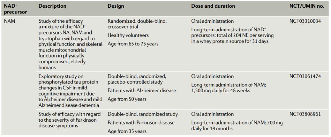 总之,以上讨论的有关NAD+前体的临床前结果表明,NAD+的增强可以改善哺乳动物的健康状况甚至延长寿命。NAD+前体在其它动物中表现出的这些有益作用可能在人类身上也有用,目前正在临床试验中进行测试(表 2)。