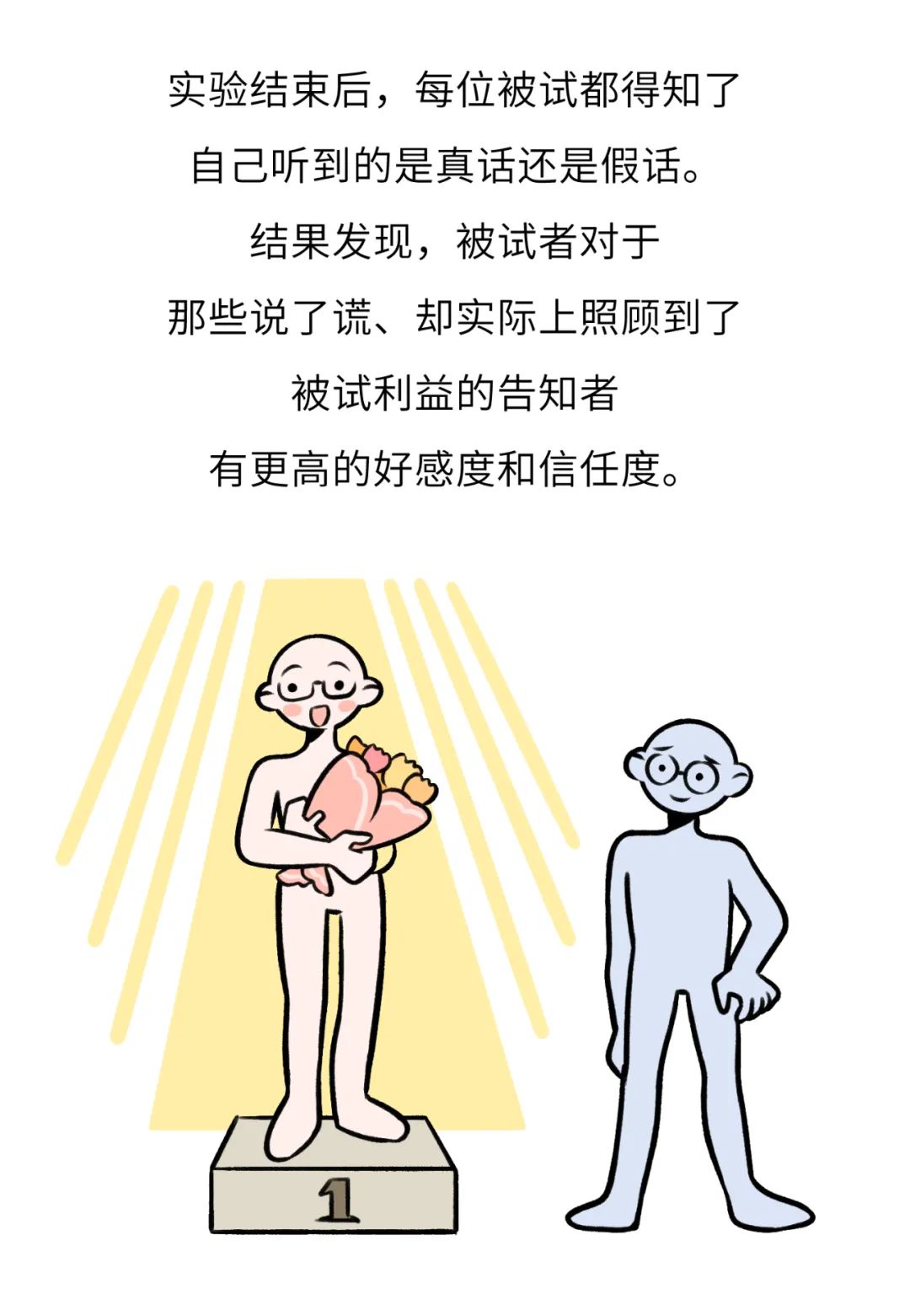 可以看出,人们对另一个人的看法,并不会简单地因为谎言而折损;相反,人们可能从谎言中感受到善意,感觉自己在“被维护”,从而加深对对方的感情。3)一定程度的幻想和美化很有必要,可以提高双方对关系的满意度。
