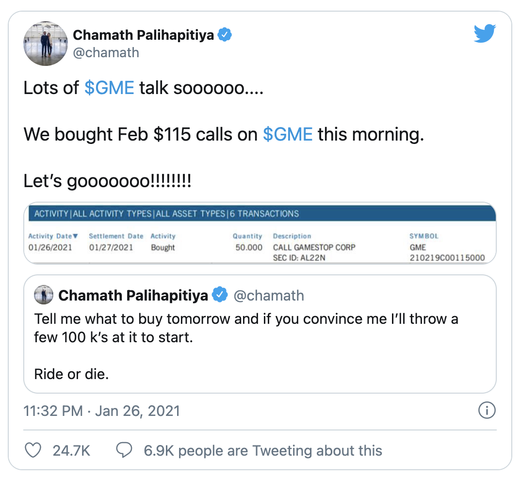 1月26日,帕利哈皮提亚对他关注者称:“告诉我你们明天打算买什么,如果能说服我,我就先买10万。”随后他购买了游戏驿站看涨期权,并贴出截图。