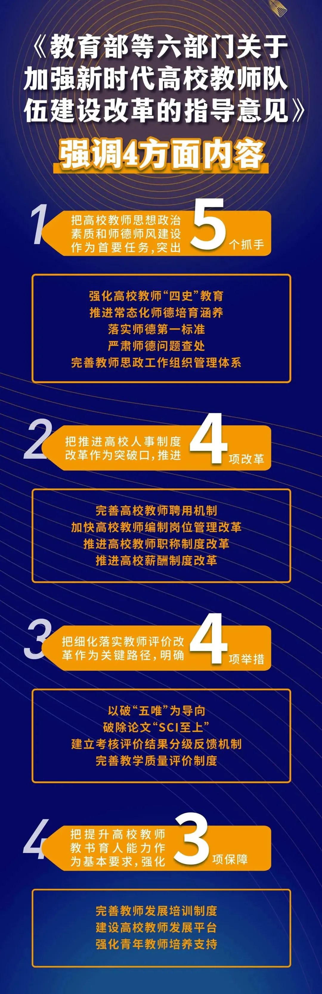 近日,教育部等六部门印发《关于加强新时代高校教师队伍建设改革的指导意见》,深入落实中共中央、国务院《关于全面深化新时代教师队伍建设改革的意见》和《深化新时代教育评价改革总体方案》,推进加强新时代高校教师队伍建设改革。