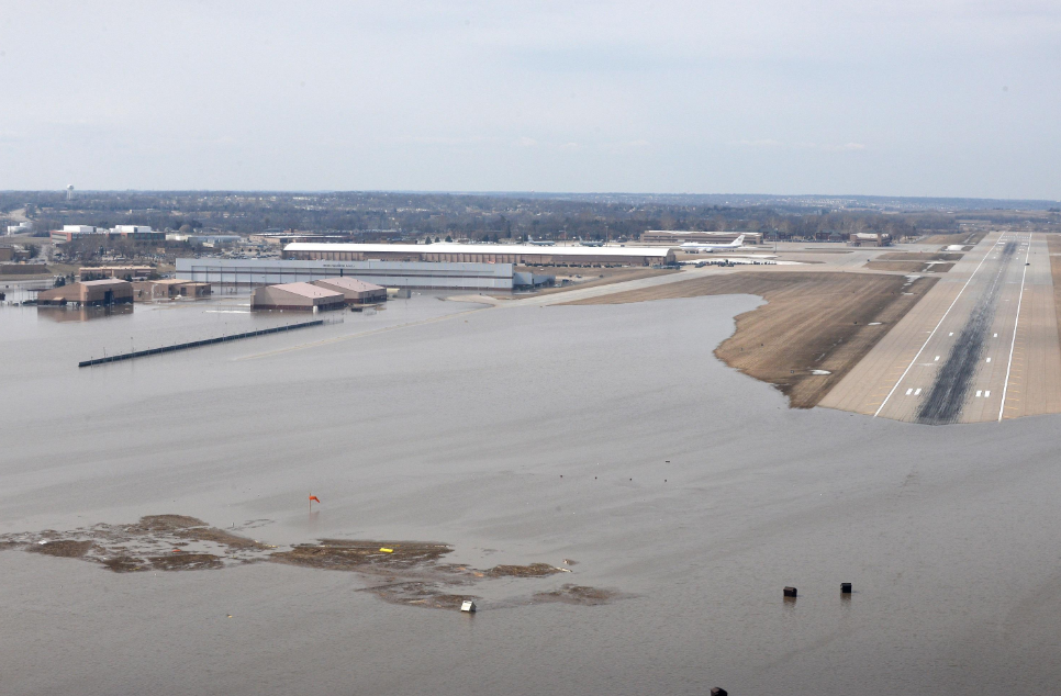 2019年3月,美国中西部几个州遭遇冬季风暴侵袭,内布拉斯加州的奥夫特空军基地有三分之一被汹涌的洪水淹没。奥夫特空军基地位于奥马哈市贝尔维尤,是美国战略司令部的总部,该基地部署了用于指挥核武器的战略指挥机等军机。