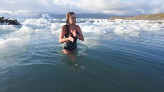 她把头泡进水里,听到冰山迸裂的声音,甚至从数英里以外传来的声音,还能听到鲸鱼的嘈杂声从黑水深处传来:“整个体验是如此神奇,我真的很难集中精神在我的身体和生理反应上。我只是在想,此时此刻多么美,多么超现实!”