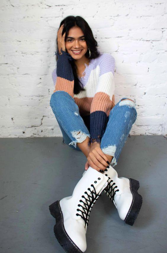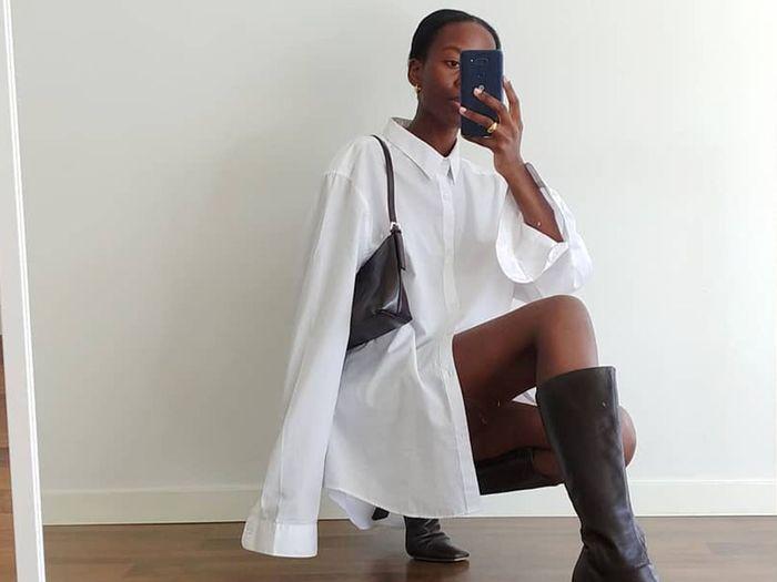 短款的衬衫裙、背带裙或者毛衣裙,都可以直接搭配马靴,又甜又飒。