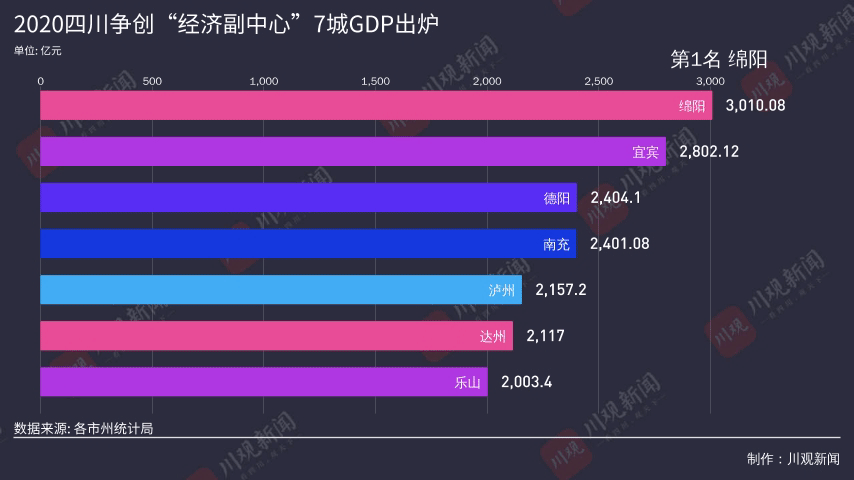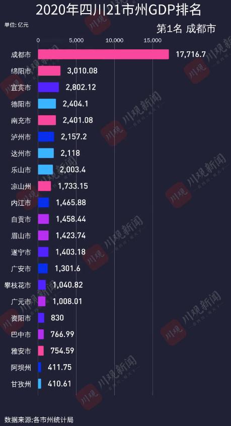 随着1月21日省统计局发布2020年全省经济运行情况,四川各市州也相继揭晓过去一年的成绩单:绵阳首次突破3000亿元大关,宜宾触线2800亿元,乐山迈入2000亿元门槛,这意味着四川跻身“两千亿”GDP俱乐部的市州达到7个(不含成都),相比2017年增加了6个。市州格局发生深刻变化,关键词叫南北赶超、竞相发展。