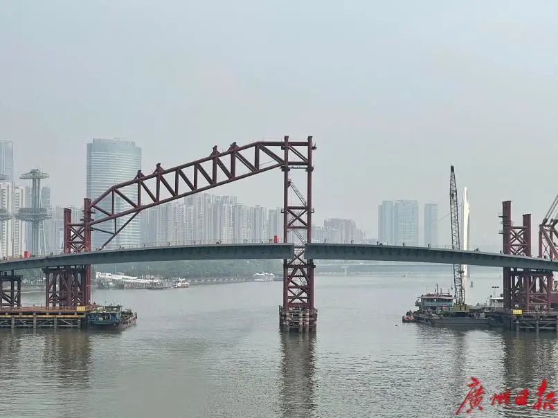 位于广州中轴线上,连接二沙岛和广州塔的首座人行景观桥建设进度加速,桥身合龙在即,雏形初现。高耸的桥拱、弧线的造型,彷佛一道彩虹跨过珠江,与广州塔和珠江新城东西二塔交相辉映。