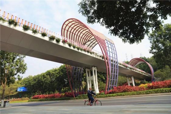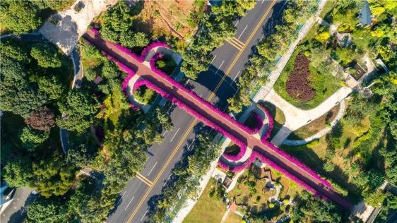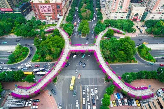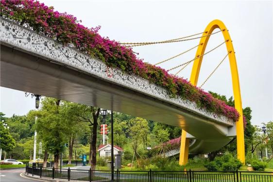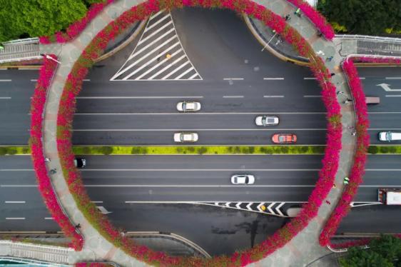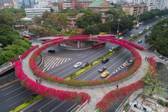 图/Gzphotos从高空鸟瞰这座天桥好似在一条黑色缎带上镶嵌了一个大大的玉环,于是被成为「玉环天桥」。到了簕杜鹃盛放的季节,整座天桥被装扮成花的海洋。