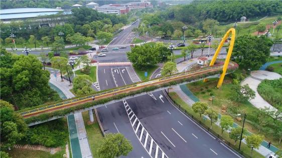 科学城有一条长度达13.12公里的云端绿道,6座空中连廊,把依山而建的狮子岭、换山岭、牛角岭体育公园等7个公园串联起来,并且连通了科学广场和绿轴广场。