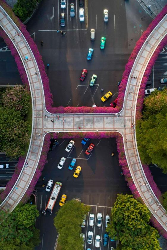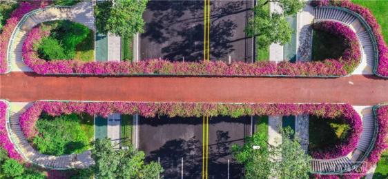 从高空中俯瞰,一条蜿蜒的粉红色彩龙腾跃在映日路上。搭配上超高颜值的绿化植被,即使身边车水马龙,也依然能够听到鸟语,闻到花香。