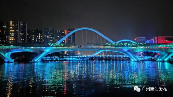 蓝色外观的人行桥,横架在蕉门河上。桥上覆流线型的铝合金遮阳板,如海浪起伏,故名为“海浪桥”。