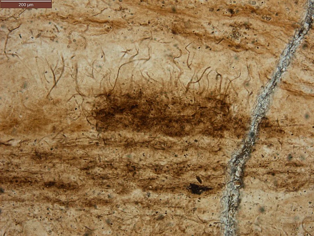 这些纹层不仅是叠层石的生长历史,也是地球的编年史书,研究者们甚至可以通过研究微米级别的叠层石纹层,推断出15亿年前的一年有546天,而一个月相周期长达42天。纹层里还保存了许多微生物的遗迹,比如节律性生长的蓝细菌丝体化石,蓝细菌逃逸或穿石的现象,蓝细菌呼吸的气泡等等。