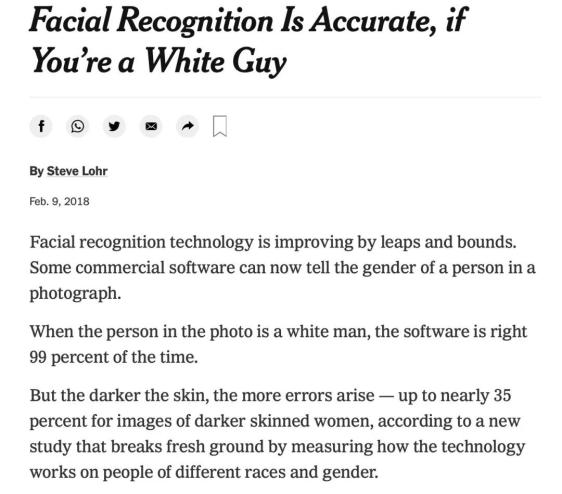 2018 年,美国《纽约时报》发表过一篇文章,引用美国麻省理工学院的最新研究论文,证实在不同种族面前,人脸识别的准确率存在巨大差异。