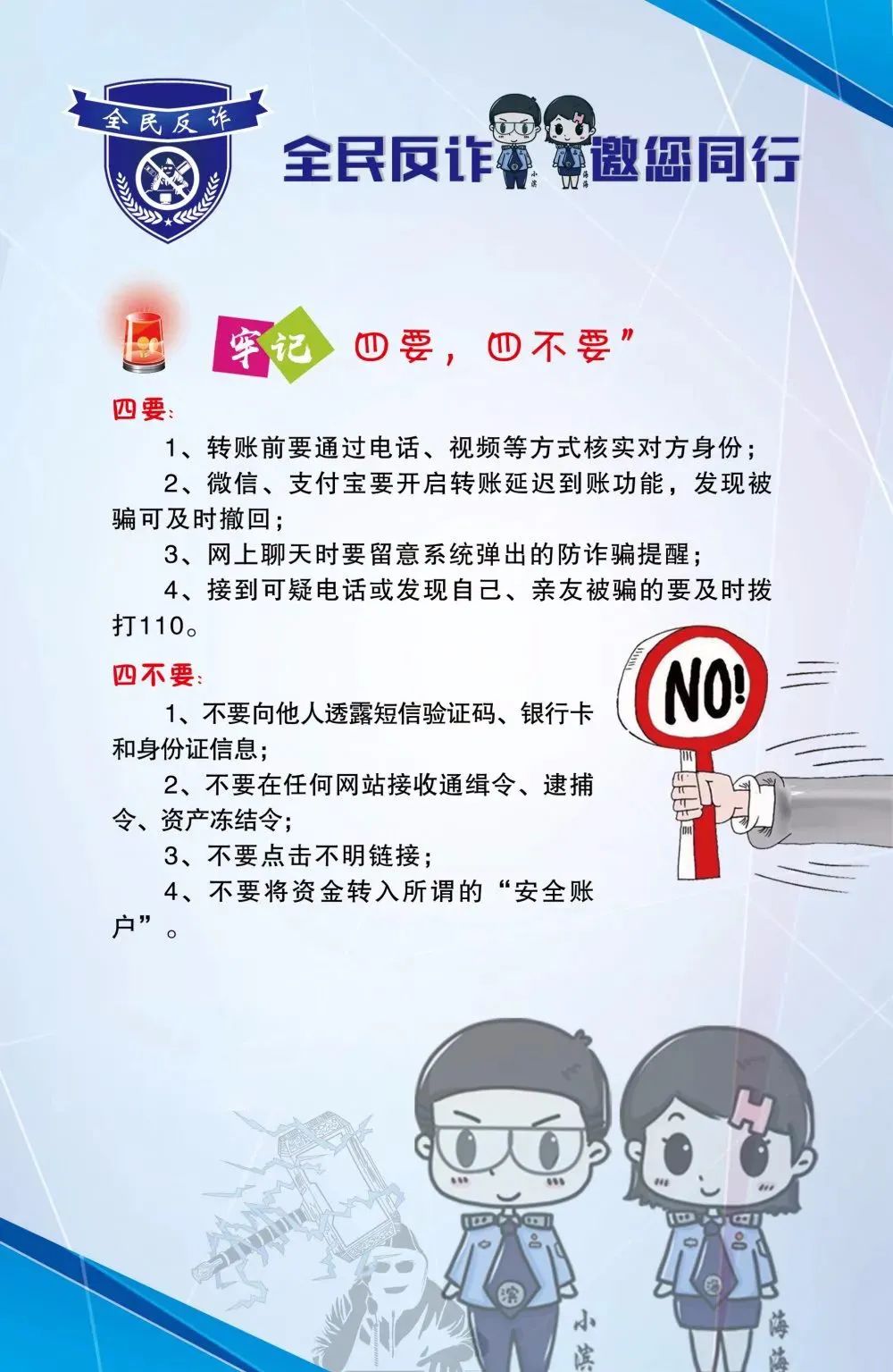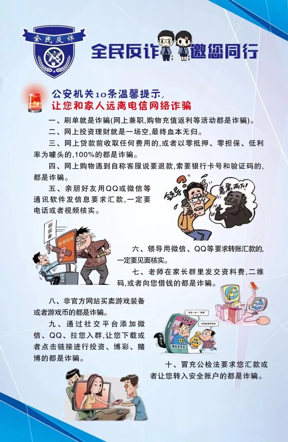2、不要随意提供身份证号、银行卡账号、验证码等重要信息,切勿随意扫描对方发来的“二维码”,更不要轻易点开来历不明的“网页链接”,谨防木马病毒或误入钓鱼网站。