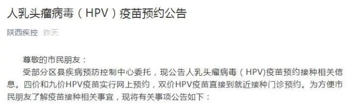 陕西省疾病预防控制中心发布人乳头瘤病毒(HPV)疫苗预约公告