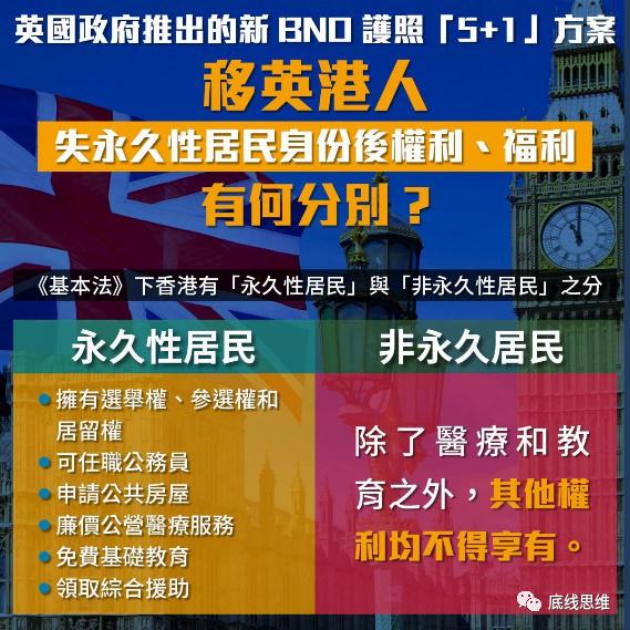 从1月31日起,英国政府将开放BNO持有人申请“5+1”签证,即BNO持有人及其近亲家庭成员(包括配偶、未成年子女、1997年7月1日及以后出生的成年子女、需要接受看护的其他亲属)能够在英国居留5年,之后可再申请定居,定居满1年后可正式申请成为英国公民。