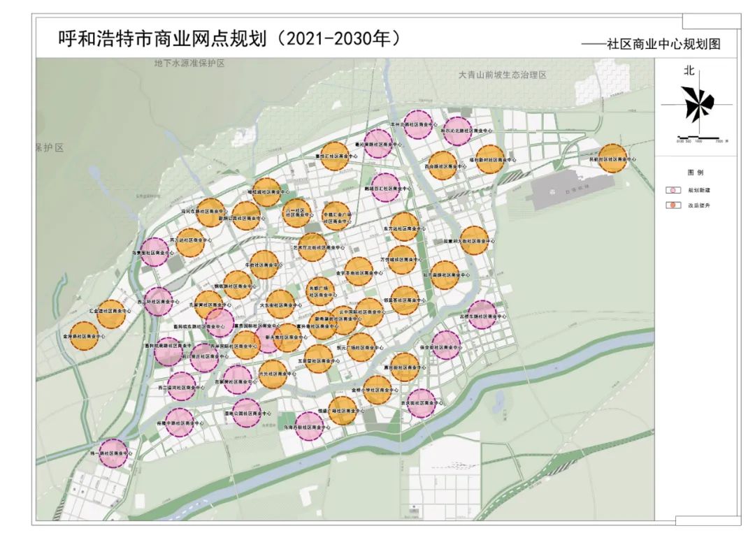 多点:指结合居住人口分布,协调城市商业中心、片区商业中心布局,合理布局的 51 处社区商业中心,构建符合呼和浩特现状和发展要求,均衡布局的便民生活服务圈。