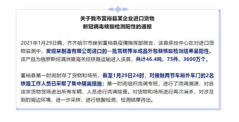 2021年1月29日晚,齐齐哈尔市接到富裕县疫情指挥部报告,该县疾控中心在对进口货物监测中,发现某制造有限公司进口的一批雪糕棒半成品外包装核酸检测结果呈阳性。该产品为俄罗斯经满洲里海关经铁路运输进入该县,共计46.4吨、75件、3600万个。富裕县第一时间封存了货物和场所,截至1月29日24时,对接触两节车厢外车门的2名铁路工作人员已采取了集中隔离措施;第一时间组织流调专班,进行了流调溯源,对自该宗货物货场进出所有车辆、人员进行流调排查。对货物和场所进行再次消杀,对涉及到的周边环境,进一步采样,进行核酸检测,检测结果待出。