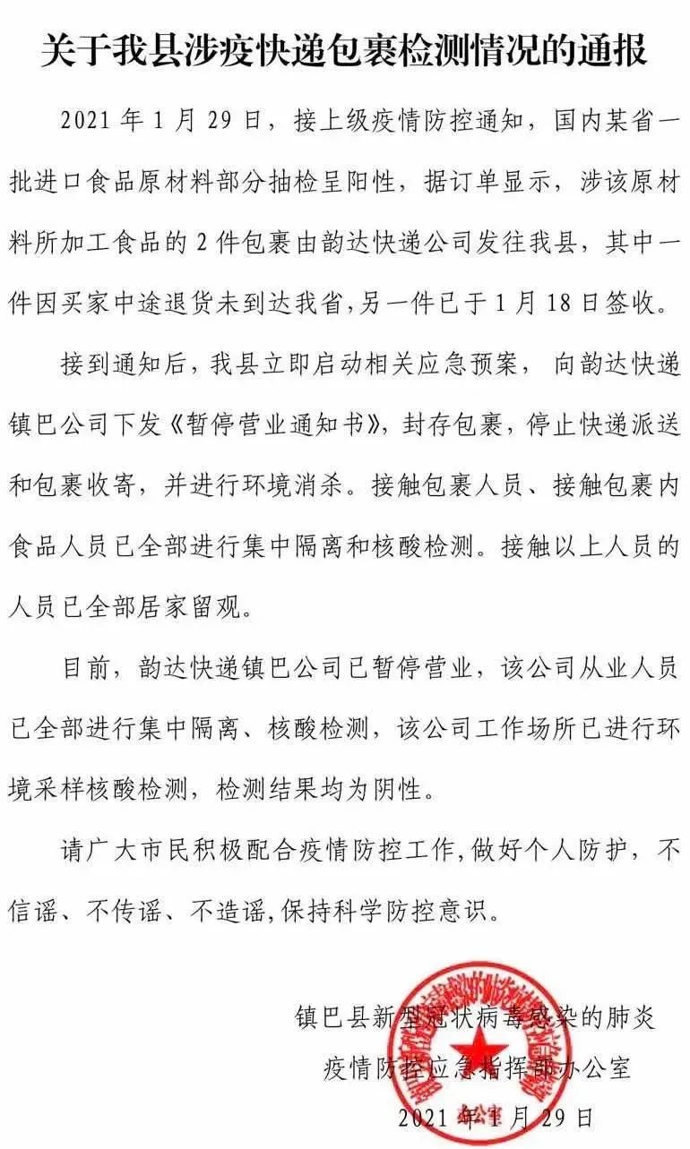 通报中显示,2021年1月29日,接上级疫情防控通知,国内某省一批进口食品原材料部分抽检呈阳性。据订单显示,涉该原材料所加工食品的2件包裹由韵达快递发往镇巴县,其中一件因买家中途退货未到达陕西省,另一件已于1月18日签收。