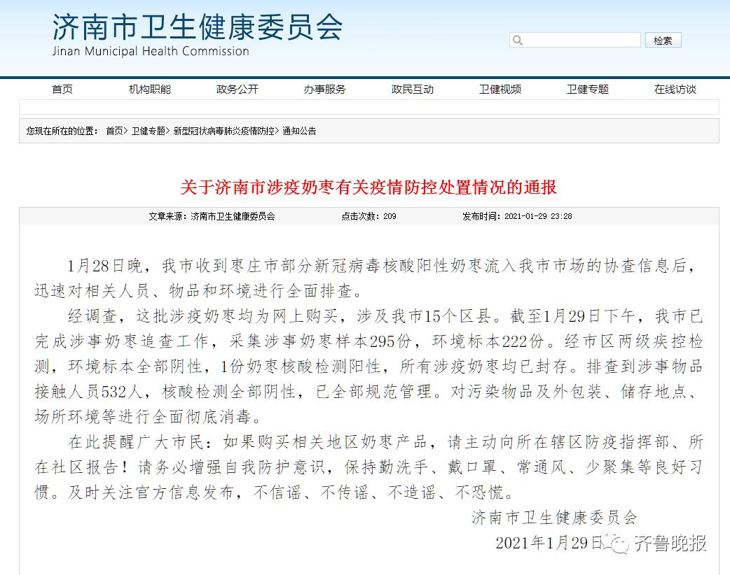 经调查,这批涉疫奶枣均为网上购买,涉及济南市15个区县。截至1月29日下午,济南市已完成涉事奶枣追查工作,采集涉事奶枣样本295份,环境标本222份。经市区两级疾控检测,环境标本全部阴性,1份奶枣核酸检测阳性,所有涉疫奶枣均已封存。排查到涉事物品接触人员532人,核酸检测全部阴性,已全部规范管理。对污染物品及外包装、储存地点、场所环境等进行全面彻底消毒。在此提醒广大市民:如果购买相关地区奶枣产品,请主动向所在辖区防疫指挥部、所在社区报告!请务必增强自我防护意识,保持勤洗手、戴口罩、常通风、少聚集等良好习惯。及时关注官方信息发布,不信谣、不传谣、不造谣、不恐慌。