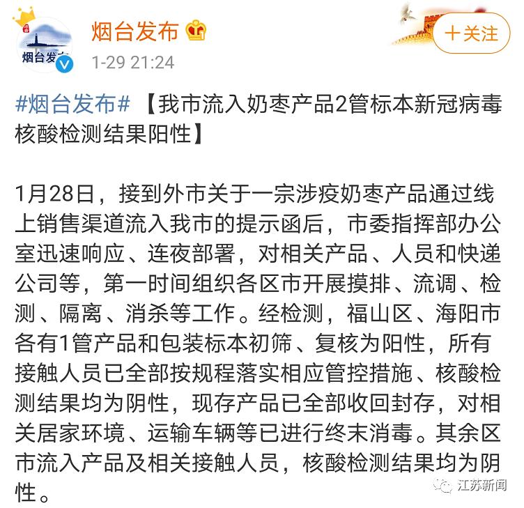 据山东省烟台市人民政府新闻办公室官方微博消息,烟台市委统筹疫情防控和经济运行工作领导小组(指挥部)办公室29日晚通报,经检测,福山区、海阳市各有1管产品和包装标本初筛、复核为阳性,所有接触人员已全部按规程落实相应管控措施、核酸检测结果均为阴性。