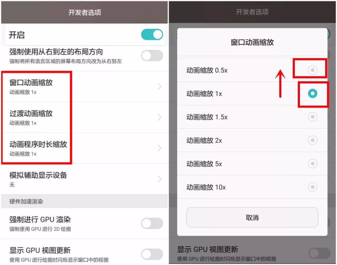 第三步:在打开的页面中,还有三个关于动画播放的按钮。分别为“窗口动画播放”、“过渡动画播放”、“动画程序时长缩放”。分别点击这三个按键,将动画缩放从1x依次调整为0.5x。