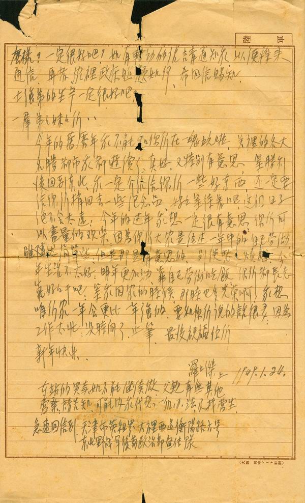 父亲,旧历年关就要接近了,家里的人们都很好吧!车站的买卖还做着吗?士勋弟(编按:写信人的弟弟罗士勋,排行老三)上学了没有?淑清(编按:写信人的爱人李淑清)现在是否还在哈尔滨工作,或是回家了?士俊兄(编按:写信人的大哥罗士俊)的工作怎么样?一定很好吧!如有转动的话请通知我,以便将来通信,再者,家里政府照顾如何,希回信赐知。