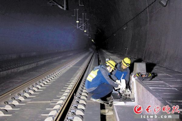 隧道内,作业人员正在使用专用测试仪器测量轨道电路参数。长沙晚报全媒体记者 吴鑫矾 通讯员 王极 摄影报道