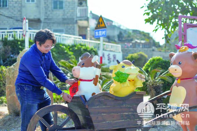 李俊宏给村头的小牛雕塑贴上福字