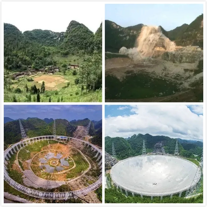FAST项目从选址到建成过程:左上台址原貌、右上台址挖掘、左下建设中、右下建成后