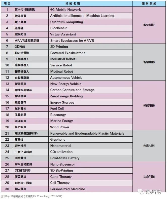 技术部分,我把台湾工研院IEK的预测未来最关键的30个技术附在这里。