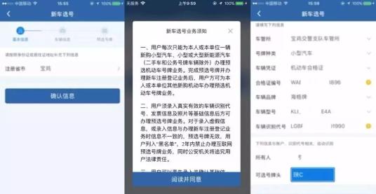 第二步:选择新车上牌所在地的城市,点击【确认信息】后,系统会弹出业务须知的对话框(业务须知具体内容由各地交管部门维护,下图只是示例,不代表本平台选号的业务须知内容),请您务必仔细阅读业务须知,了解业务相关规则。点击对话框中的【阅读并同意】按钮,进入机动车基础信息录入页面,录入内容包括合格证编号(或进口车凭证编号)、车辆品牌、车辆型号、车辆识别代码等信息。