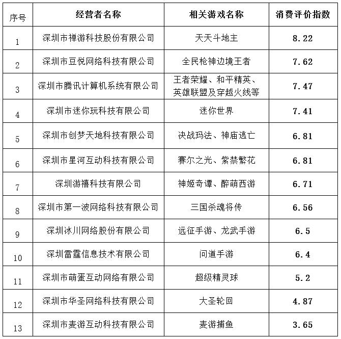 附 深圳市消委会网络游戏行业消费评价指数排行榜(2019年12月1日-2020年11月30日)