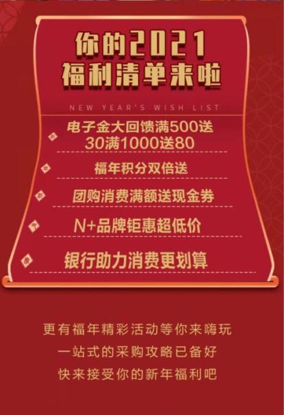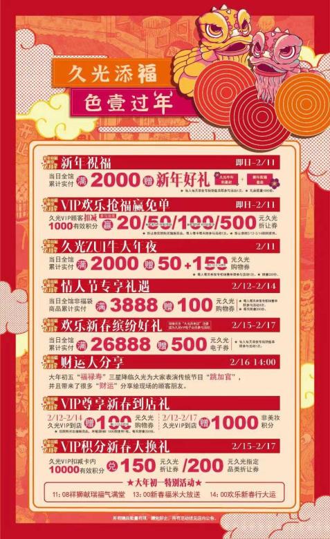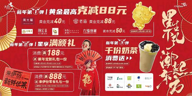除此之外,黄金最高克减88元、消费满188元赠春联礼包、消费满888元赠来伊份春节零食大礼盒、百日店庆任意消费赠千杯奶茶等促销活动。<以最终活动为准>以最终活动为准>
