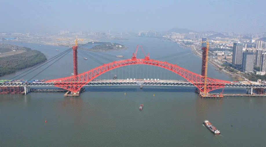 据了解,建造大跨度双主跨钢梁桥,钢桁梁和拱肋需分次进行架设和合龙。此次提升的是大里程方向柔性拱,完成合龙后,接下来将进行拱肋支架拆除及吊杆安装,小里程柔性拱已在去年12月22日完成提升合龙,为此次提升提供了精确的数据参考和丰富的实操经验。