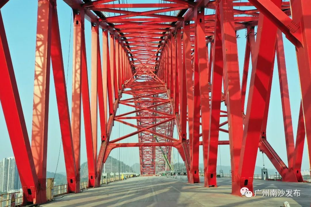 109米高的三主桁钢桁拱遍体红色,与蓝色的龙穴南水道交相辉映,远远望去如一只火红的凤凰傲立江面。这件“红色外衣”是由南沙市民通过投票选择出的。