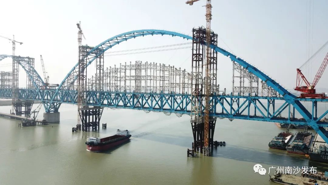 小南了解到,由中国铁路广州局集团公司江门工程建设指挥部负责建设管理、中铁六局广州公司承建的跨洪奇沥水道特大桥是南沙港铁路全线的关键性控制工程,主桥全长998米,主跨360米,采用双主跨钢桁梁柔性拱技术建造,为目前国内外同类型桥梁最大跨度,被誉为“亚洲第一跨”。