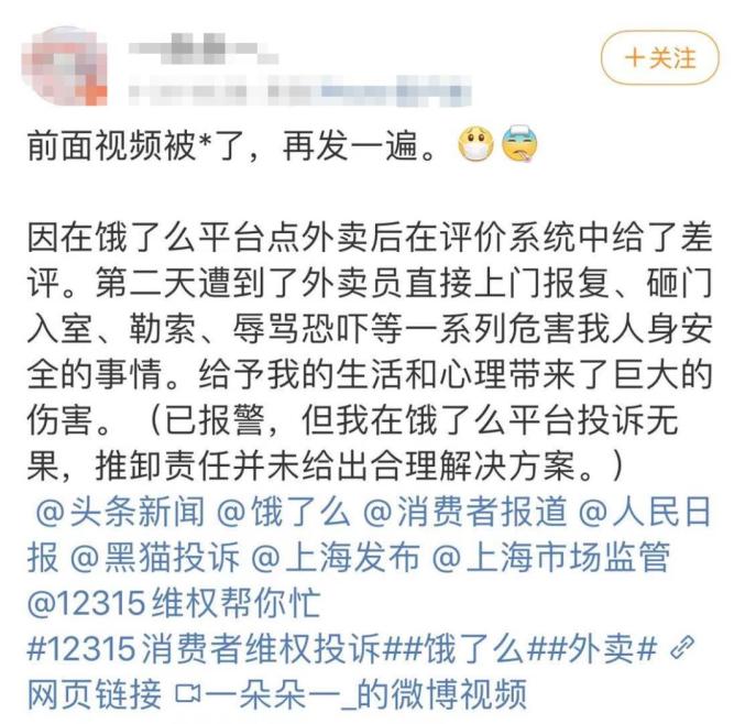 1月31日,上海的张女士在微博发文,称自己因点外卖给差评,被外卖员上门报复、辱骂恐吓。