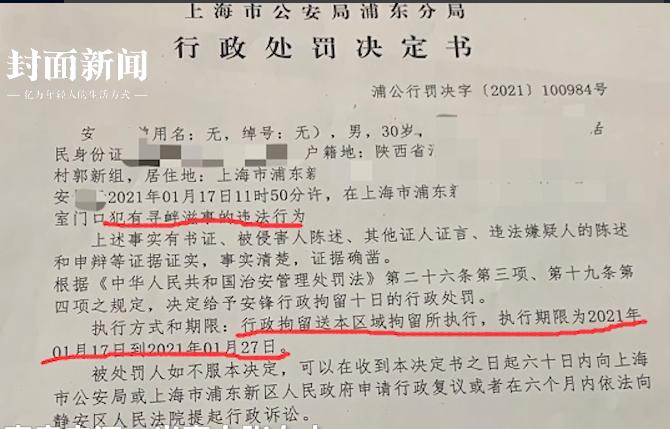 2月1日,张女士称已报警。警方出具的行政处罚决定书显示,外卖员因寻衅滋事被拘留十日。