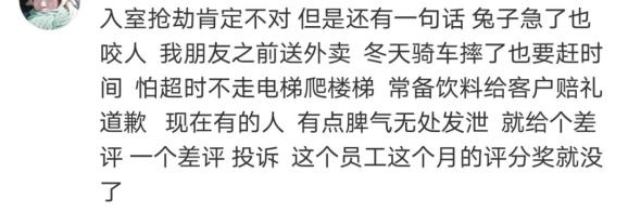 “平台长期对骑手的差评压榨”也有网友清醒地指出,一件小小的“送外卖风波”,差点变成“入室抢劫”,问题的症结不在顾客也不在外卖员,而在于外卖平台。