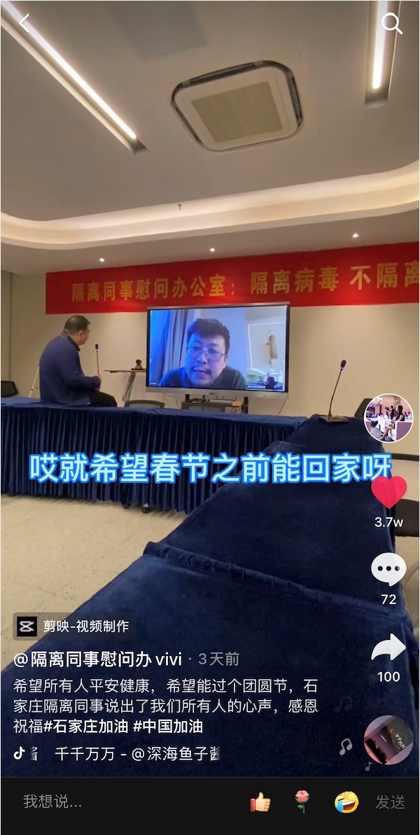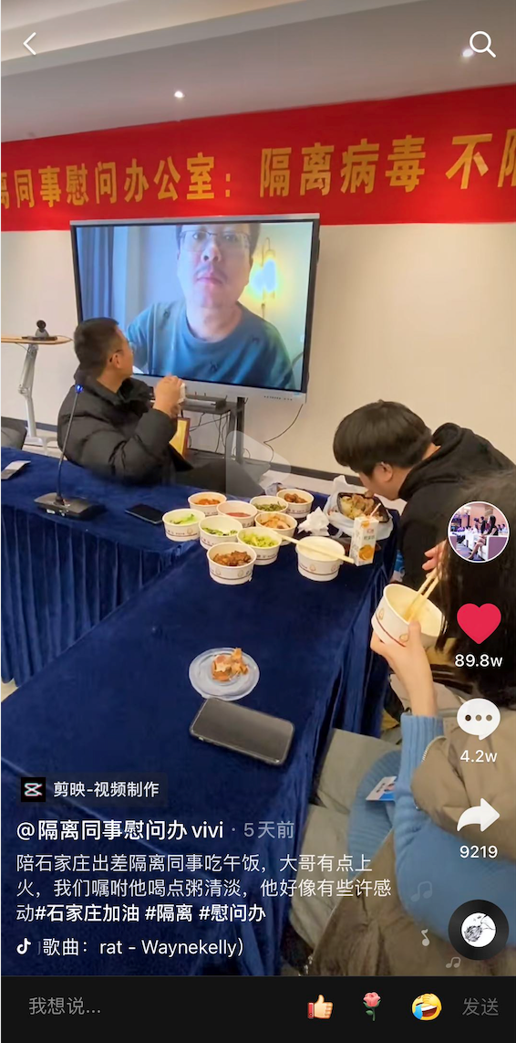 1月25日,庞大海因为一条同事“偷拍”的视频走红抖音,当时他一脸胡茬、神情恍惚地出现在公司的视频会议上。因为碰上石家庄的疫情管控,出差过去的他已经在宾馆“憋”了21天。看到他的状态,老板当即决定不开会了,同事们集体陪他聊天,防“抑郁”。很快,公司还成立了“隔离同事慰问办”,每天陪他远程视频,换班“唠嗑”。