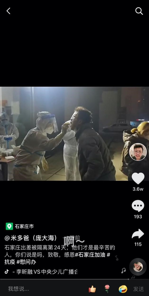 那天晚上,好多朋友突然给我打电话,问那是不是你?我才知道自己在抖音上火了。还有朋友问我媳妇,孩子的幼儿园老师都问她,那是不是你老公?后来公司也成立了“慰问办”,没事儿就跟我们聊聊天,网友评论也多,一下就忙起来了,很多事情把你的时间都填充起来,感觉过得很充实。而且那之后,石家庄也在一点点恢复,可以下楼了、超市也开门了,人、车辆又自由流动了。