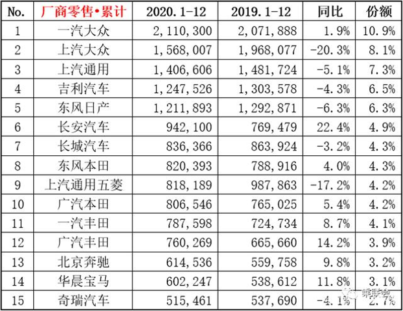 虽然疫情使得汽车行业受到影响,但一汽大众(包括大众品牌、捷达品牌和奥迪品牌)依然保住了龙头的位置,全年累计终端销售2161888辆(含进口车),同比增长1.5%。