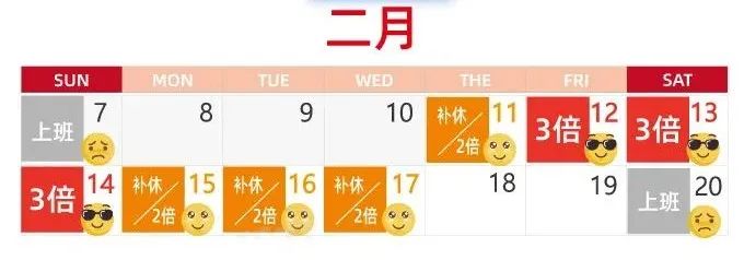 其中2月12日、2月13日、2月14日三天为法定节假日,工资三倍。
