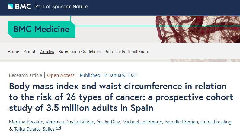 目前,已经证实肥胖与至少12种癌症类型相关。身体质量指数(BMI)常被作为肥胖的评估指标, 此外,腰围(WC)也作为中心性肥胖的评价标准之一,已被认为会增加几种癌症类型的风险,并能更好地分辨与肥胖相关的结肠癌和绝经后乳腺癌的风险。近期,一项发表在BMC Medicine的360万人大型队列研究进一步证实,BMI和腰围与多种癌症风险相关。