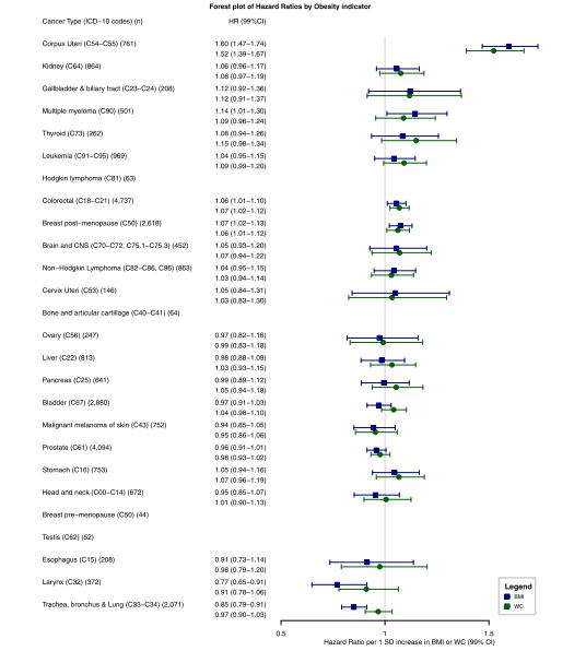 研究结果显示,较高的BMI与9种癌症(子宫冠状动脉、肾脏、胆囊、甲状腺、结直肠、乳腺绝经后、多发性骨髓瘤、白血病、非霍奇金淋巴瘤)的风险呈正相关,并与从不吸烟者中的另外3种癌症(头颈部、脑和中枢神经系统、霍奇金淋巴瘤)呈正相关。各自的危险比(HRs)(每增加5kg/m2)从非霍奇金淋巴瘤的1.04(99%CI 1.01~1.08)到子宫体癌的1.49(1.45~1.53)不等。虽然在总体人群的线性分析中,BMI与5种癌症类型呈负相关,但检查非线性后发现,BMI与前列腺癌呈U型相关,与头颈癌、食管癌、喉癌和气管癌、支气管癌和肺癌呈L型相关,说明低BMI是大量吸烟的结果。在291305名有WC测量的参与者中,有27837人被诊断为癌症。所有癌症的BMI和WC与所有癌症的HR点估计值(每增加1个标准差)的99%置信区间重叠,提示BMI和WC与癌症风险的关系相当。